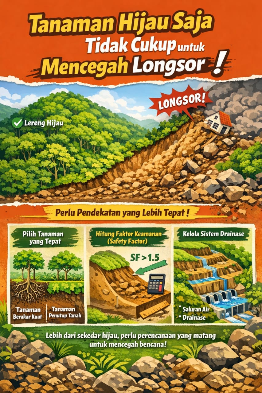 Pada musim hujan, risiko longsor di Jawa Barat meningkat tajam akibat infiltrasi air yang menaikkan tekanan pori dan menurunkan kuat geser tanah. Dalam kondisi tersebut, vegetasi dengan sistem akar dangkal tidak mampu menahan pergerakan massa tanah, sehingga *program penghijauan tanpa analisis teknis justru menciptakan rasa aman semu*.